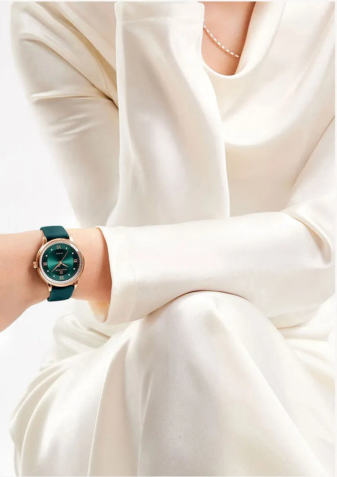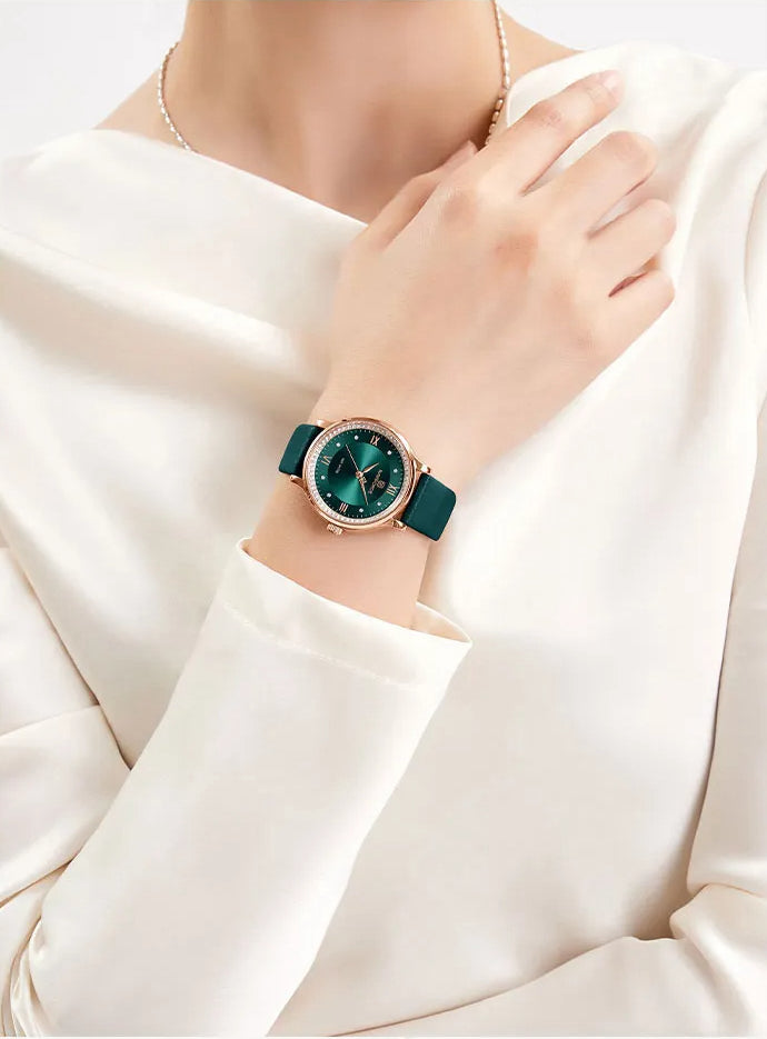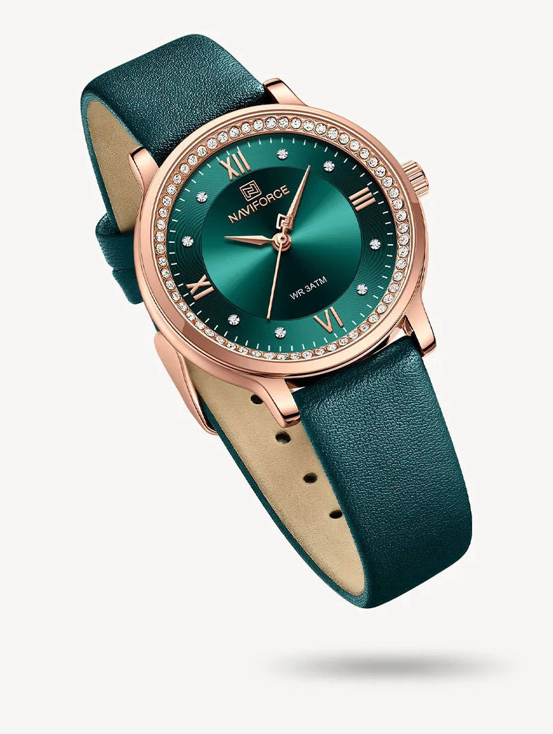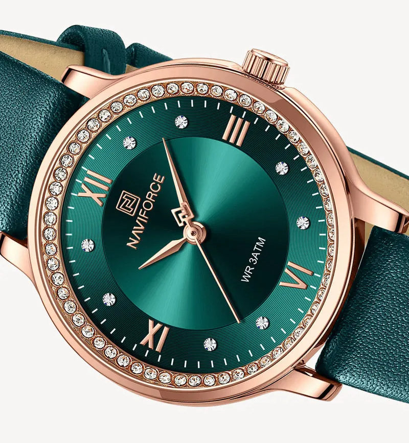 "Aurum Floresta" é uma obra-prima da elegância e sofisticação. Com uma pulseira de couro verde e um mostrador adornado com um vidro curvo liso, este relógio transcende a beleza convencional. O efeito da lupa 3D aumenta a clareza da luz, complementando a superfície cravejada de diamantes, criando um brilho cintilante sem fim, que brilha como as estrelas. Equipado com um movimento de quartzo confiável, este relógio é mais do que apenas uma peça de precisão, é uma expressão de estilo refinado e graça atemporal. Adequado para todas as ocasiões, o "Aurum Floresta" é o companheiro perfeito para a mulher moderna que valoriza a elegância e a distinção em cada momento da vida.
