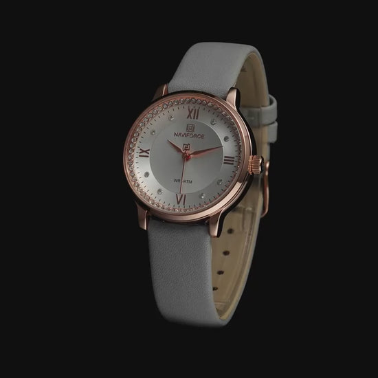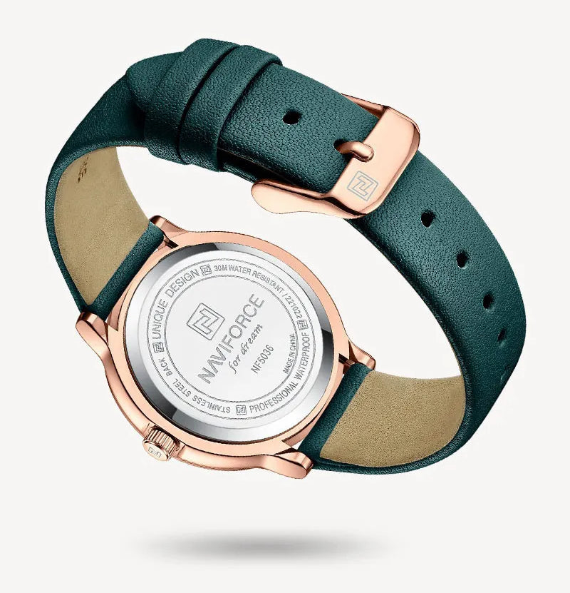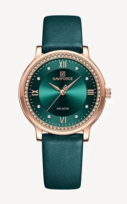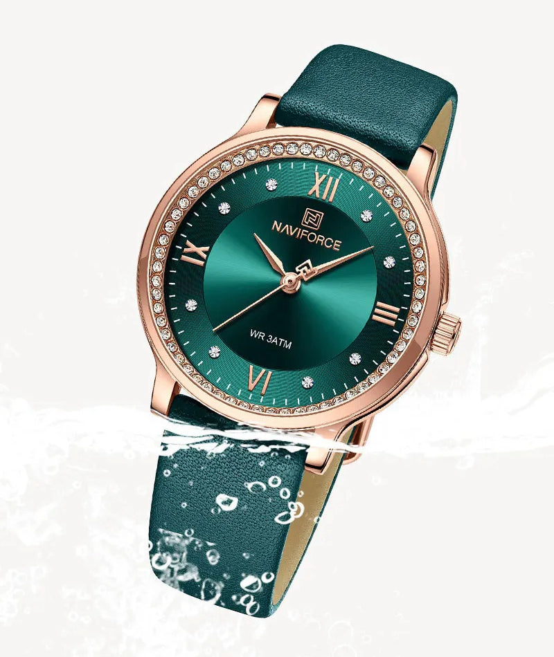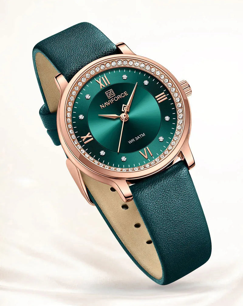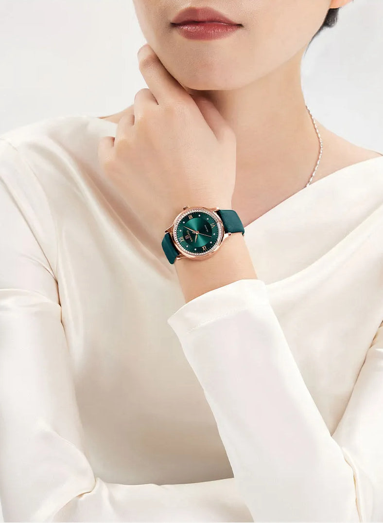 "Aurum Floresta" é uma obra-prima da elegância e sofisticação. Com uma pulseira de couro verde e um mostrador adornado com um vidro curvo liso, este relógio transcende a beleza convencional. O efeito da lupa 3D aumenta a clareza da luz, complementando a superfície cravejada de diamantes, criando um brilho cintilante sem fim, que brilha como as estrelas. Equipado com um movimento de quartzo confiável, este relógio é mais do que apenas uma peça de precisão, é uma expressão de estilo refinado e graça atemporal. Adequado para todas as ocasiões, o "Aurum Floresta" é o companheiro perfeito para a mulher moderna que valoriza a elegância e a distinção em cada momento da vida.